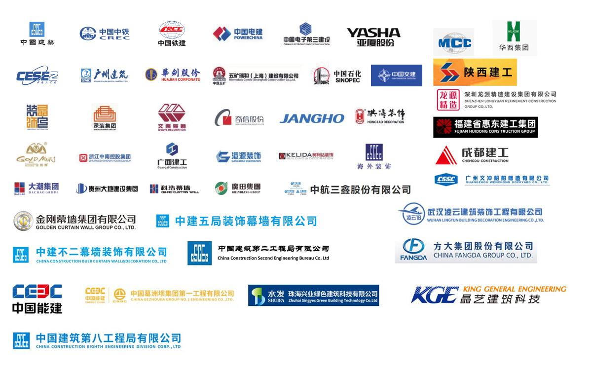 公司參建了諸多大型項目工程,如港珠澳大橋、珠海國際航展、深圳國際會展中心、廣州白云機場、西安全運會場館、成都東安湖大運會場館、樂山奧體中心、洛陽奧體中心、增城富士康廠房、惠州中海油、陽江核電站、珠三角各地鐵線、高鐵站、廣西桂林機場、廣西柳州文化廣場、四川成都天府機場、海南海口美蘭機場、西安絲路會展中心、惠州北站等等。與中國建筑、中國中鐵、中國鐵建、中國電建、中國交建、中國中冶、中國能建、廣東建筑、廣西建工、廣州建筑等大型國有企業(yè)下屬公司及江河幕墻、金螳螂裝飾等各大建筑裝飾、幕墻裝飾公司達成長期友好合作關(guān)系。